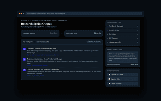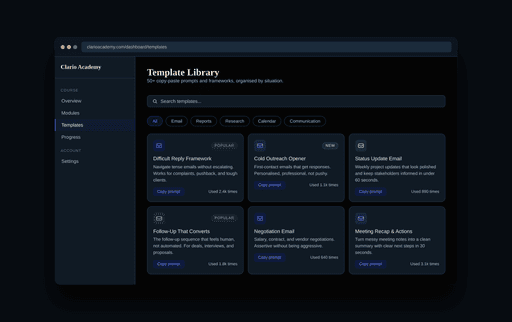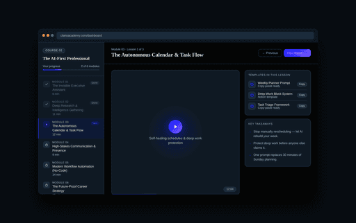 Every lesson is built around what professionals actually do at work — not generic AI tips you could find on YouTube. You leave each module with something you can use the same day.