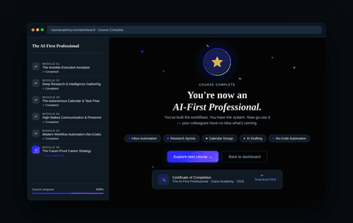 I was sceptical at first. I've done plenty of courses that promised a lot and delivered PowerPoints. This was different. By the end of the first module I'd already changed how I handle my inbox. My manager actually asked me last week how I'm turning around reports so fast.