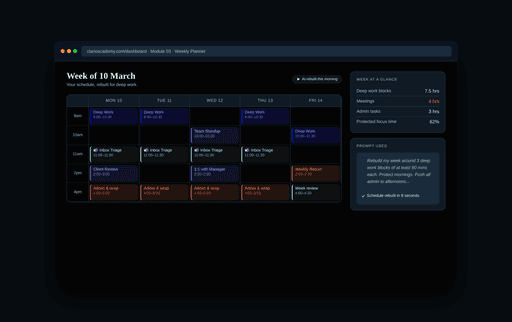 Stop losing your best hours to admin. Build a week that protects your focus.